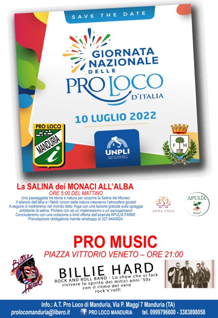 Domenica 10 luglio si svolgerà la ‘Giornata Nazionale delle Pro Loco’, un evento a cadenza annuale organizzato dall’UNPLI che vede protagoniste tutte le Pro Loco d’Italia e che intende mettere in risalto la loro fondamentale attività di salvaguardia del patrimonio culturale nazionale. Un appuntamento importante, al quale la Pro Loco di Manduria non poteva certo mancare, per questo settore dell’associazionismo impegnato nella tutela delle tradizioni e nella promozione dei molteplici aspetti che caratterizzano l’identità di un’area e della comunità che la abita.