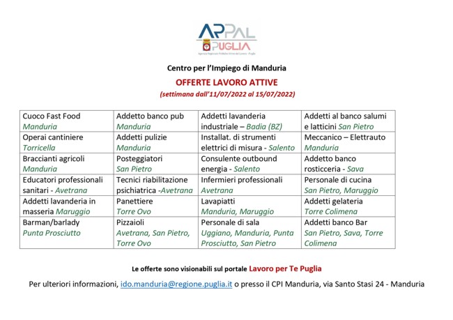 Per ulteriori informazioni, occorre recarsi presso il Centro per l’Impiego di Manduria.