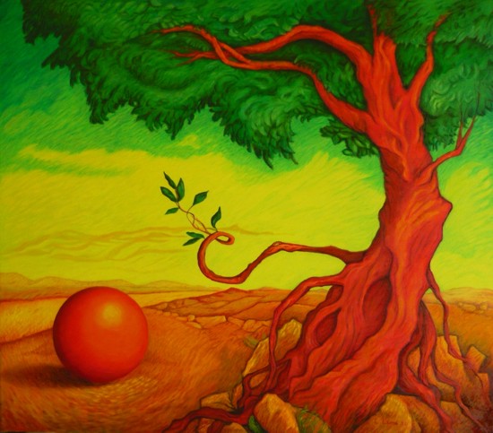 «Ho scelto questi elementi per esprimere il rapporto tra Finito e Infinito – spiega l’artista, soffermandosi sul contenuto simbolico delle sue opere – L’albero simboleggia l’uomo, la sfera rimanda alla Perfezione. L’albero è il collegamento tra la terra e il cielo. Ho voluto mettere in relazione questi due elementi apparentemente discordanti. Se non avessi realizzato la sfera il dipinto sarebbe stato un semplice paesaggio. Non mi interessa rappresentare un paesaggio. Voglio piuttosto riflettere sul Senso della vita».