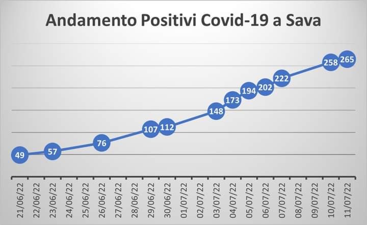 «Alla data dell’11.07.2022, data dell’ultimo report ricevuto, i positivi a Sava sono 265 e risultano tutti in “isolamento domiciliare per positività al test” antigienico. Dai dati in mio possesso, non risultano casi gravi e ospedalizzazioni collegate al COVID-19. Ribadisco tutte le raccomandazioni del post precedente e di tenere un comportamento attento al fine di evitare il contagio».