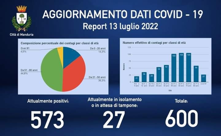 Alla data del 13 luglio vi erano 573 positivi (+164 rispetto al 7 luglio) e altri 27 manduriani in isolamento o in attesa di tampone (+18), per un totale di 600 (+182).