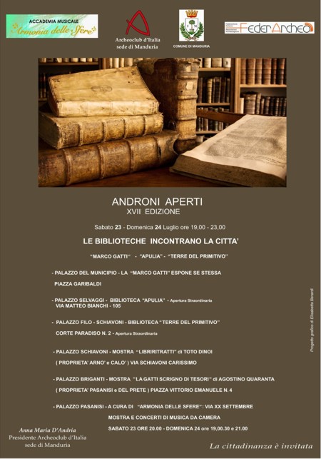 Sabato 23 e domenica 24 luglio 2022, dalle ore 19:30 alle 23, dopo l’interruzione di due anni causata dalla pandemia, ritorna la storica manifestazione di Archeoclub “Androni Aperti”.