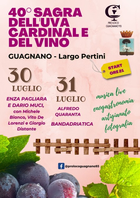 Torna la festa dell’uva, della musica e del buon cibo. Torna dopo due anni di stop a causa della pandemia, l’evento più atteso dell’estate guagnanese. Il 30 e 31 luglio va in scena, nella storica location di Largo Pertini, la 40° Sagra dell’Uva Cardinal e del Vino, organizzata dalla Pro Loco Guagnano ’93 in collaborazione con il Comune di Guagnano. Torna nella sua formula tradizionale, fulcro imprescindibile della storia del posto, per far festa tutti insieme attorno a quel tassello irrinunciabile della tradizione locale che si scrive Uva Cardinal ma si legge storia, cultura, radici, preziosità e autenticità.