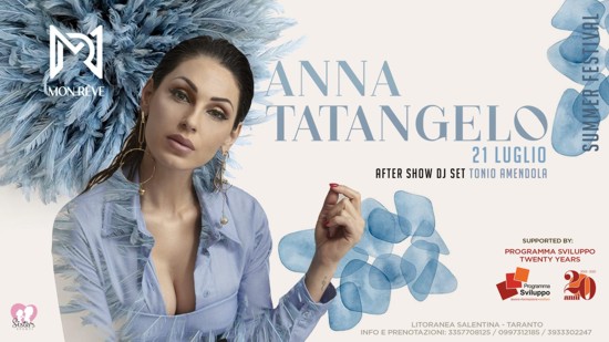 È l’ex enfant prodige della musica italiana. Oggi, poco più che trentenne, ha già ottenuto dischi d’oro e di platino. Giovedì 21 luglio, sul palco del Mon Rêve di Taranto, in concerto Anna Tatangelo. In scaletta, i suoi più grandi successi. La serata rientra nel “Summer Festival” organizzato dal Mon Rêve con il supporto di Programma Sviluppo in occasione del ventennale di attività e con la direzione artistica di Sisters Eventi.