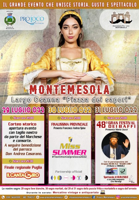 È tutto pronto a Montemesola per la consueta rassegna estiva “E... State con noi”, organizzata dalla locale associazione turistica Pro Loco, con il patrocinio dell’amministrazione comunale e dell’Unpli Puglia, in collaborazione con le associazioni ASD Gioventù Montemesola, ANT e AUSER, Confraternita di San Michele Arcangelo, i frantoiani, panificatori e produttori agricoli montemesolini.