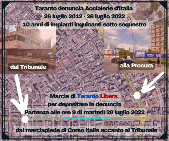«Il punto di incontro avverrà sul marciapiede di corso Italia adiacente il Tribunale, alle ore 9 di martedì 26 luglio, al fine di raggiungere gli uffici della Procura in viale Magna Grecia, percorrendo esclusivamente i marciapiedi, senza provocare intralcio alla viabilità» scrive in una nota Luciano Manna, che si definisce “uno dei tanti cittadini della Taranto Libera”. «La marcia prenderà forma sotto la sigla Taranto Libera, una sigla che appartiene a tutti i cittadini di Taranto che rivendicano i propri diritti a partire da quelli fondamentali: il diritto alla VITA, alla SALUTE