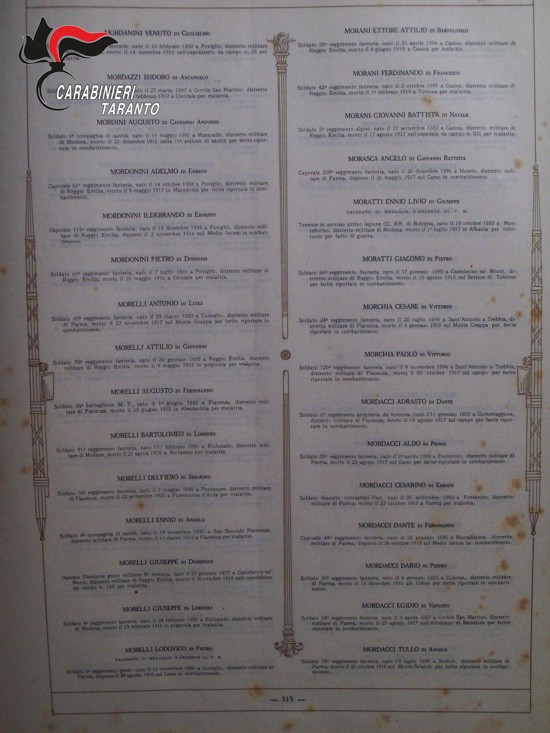 Gli uomini dell’Arma hanno subito raccolto l’accorata richiesta ed hanno avviato una serie di verifiche, consultando archivi storici e banche dati del Ministero della Difesa. Nel giro di poche settimane, sono così riusciti a ricostruire la storia di Ennio MORATTI, classe 1880, nato a Montefiorino, in vita Tenente dei Carabinieri. L’Ufficiale era in forza alla Legione “Emilia Romagna” quando, durante il primo conflitto mondiale, morì in Albania, nel corso di operazioni belliche. Venne insignito di Medaglia d’Argento al Valor Militare, alla memoria.