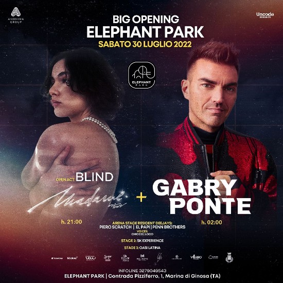 Sabato 30 luglio si terrà il primo appuntamento della nuova location Elephant Park di Ginosa Marina nel quale si svolgeranno il concerto della cantautrice Madame, che si esibirà con una tappa del suo tour estivo e il set di Gabry Ponte, dj tra i più importanti esponenti della dance italiana e membro del gruppo Eiffel 65.