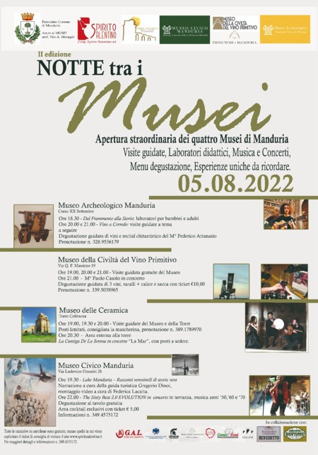 L’iniziativa gestita su prenotazioni si basa sull’apertura straordinaria dei quattro musei di Manduria che garantiranno in festa e fino a notte inoltrata entusiasmanti visite guidate alla scoperta degli antichi contenitori del vino, delle ceramiche della tradizione, degli usi e costumi della civiltà contadina e di racconti verosimili Lake Manduria tra le trame della indimenticabile esperienza di convivenza fra gli aviatori americani del 450° Bomb Group dell’ USA Air Force e la cittadinanza manduriana, cui si aggiungeranno interattivi laboratori didattici, musica e concerti di qualità, menu degustazioni con prodotti a km 0 e tante esperienze uniche ed emozionali.