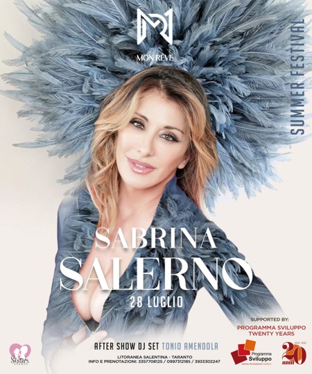 Cantante, showgirl e attrice diventata celebre negli anni ’80. Ha venduto circa 20 milioni di dischi, collezionando innumerevoli dischi d’oro e di platino e risultando tra gli artisti italiani di maggior successo. Ancora oggi è considerata un’icona della musica dance e della bellezza italiana. È Sabrina Salerno che, giovedì 28 luglio, arriva al Mon Rêve di Taranto per una serata unica. A precedere la sua esibizione sarà il ritmo travolgente di OndaSuperNova band.