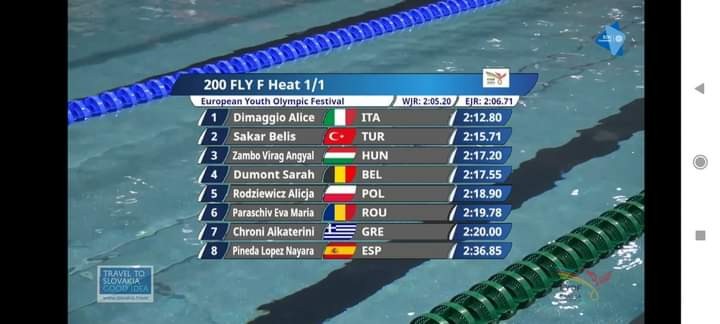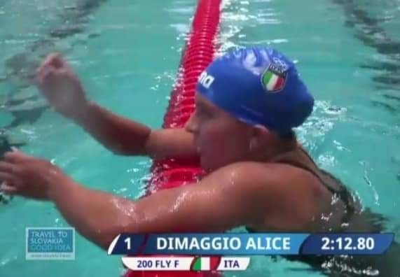 L’impresa l’ha firmata, paradossalmente, nelle batterie dell’altro ieri, battendo l’altra italiana convocata dal c.t. azzurro, ovvero Alice Bonini. Il regolamento del Festival Olimpico Europeo della Gioventù di Banska prevedeva, infatti, l’accesso di una sola atleta per nazione nella finalissima. E gli azzurri, nella gara dei 200 farfalla, schieravano ben due atlete di punta: Alice Bonini, atleta bergamasca, classe 2008, definita un nuovo fenomeno del nuoto azzurro, che in primavera aveva stabilito il proprio personale in 2’10”85, e, appunto, Alice Di Maggio, che, in quello stesso periodo aveva fatto registrare il suo miglior crono di 2’12”52 (poi migliorato ulteriormente: 2’11”69).