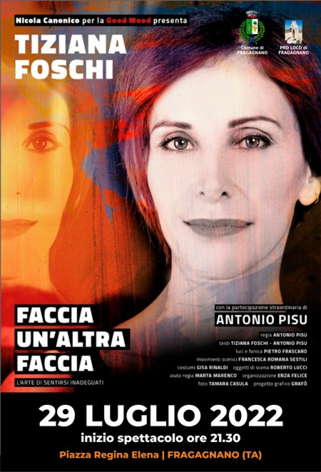 Nell'ambito della rassegna: “Non solo... Settembre fragagnanese 2022”, venerdì 29 luglio, alle ore 21.30, in piazza Regina Elena, a Fragagnano, si terrà lo spettacolo teatrale con Tiziana Foschi, la divertentissima e talentuosissima comica della Premiata Ditta e con la straordinaria partecipazione di Antonio Pisu.