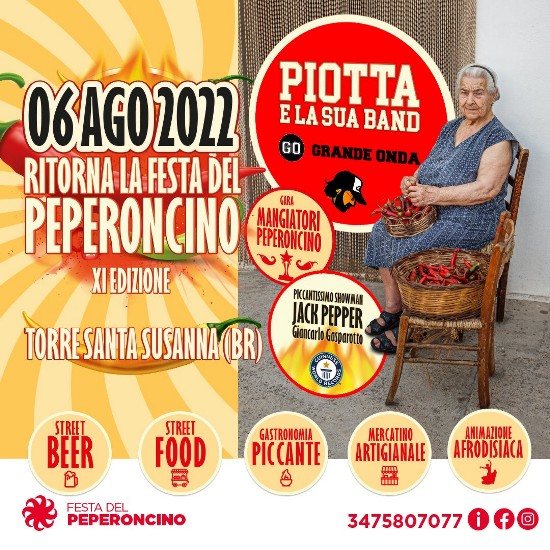 Sabato 6 agosto, alle 21:30, dopo due anni di stop forzato, torna l’appuntamento più piccante dell’estate e torna in pieno centro, in largo Convento a Torre Santa Susanna. Stiamo parlando dell’undicesima edizione della “Festa del Peperoncino… Il Ritorno”.
