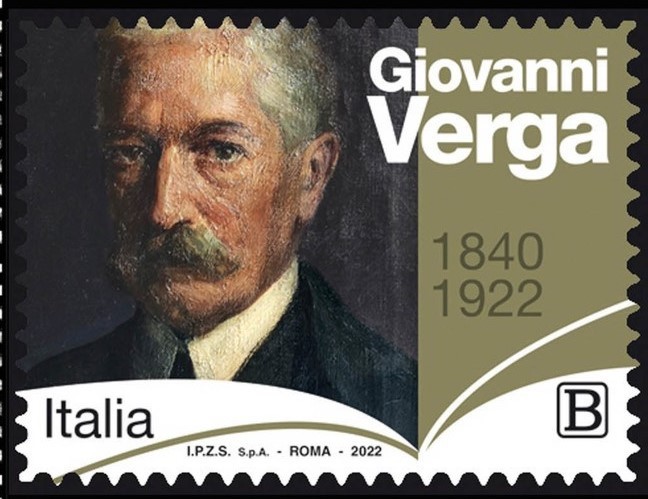 Il francobollo commemorativo di Giovanni Verga presenta in basso la stilizzazione di un libro aperto (il bozzetto è a cura del Centro Filatelico della Direzione Operativa dell’Istituto Poligrafico e Zecca dello Stato), un ritratto pittorico di Giovanni Verga, (opera di Amedeo Bianchi realizzata intorno al 1913, esposto nella Casa Museo Verga a Catania). Completano il francobollo l’indicazione del nome dello scrittore, le date “1840-1922”, la scritta “ITALIA” e le indicazioni tariffarie.