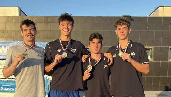 STAFFETTA 4X100 MISTA – La medaglia d’oro è arrivata con la staffetta 4x100 mista. I quattro atleti del Centro Nuoto Torino (Simone Dutto, Ludovico Viberti, Lorenzo Cavedini e Fernandez de Losada), che vediamo nella foto in alto (Lorenzo Cavedini è il terzo da sx), si sono imposti con il tempo di 3’43”71, con un vantaggio abbastanza netto (1”18) sulla Rari Nantes Florentia e (1”34) sull’Aniene, rispettivamente seconda e terza,