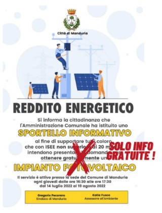«L’Amministrazione passa dal propagandare “come ottenere gratuitamente un impianto fotovoltaico” (come risulta dal manifesto), al “fornire informazioni gratuite”…»