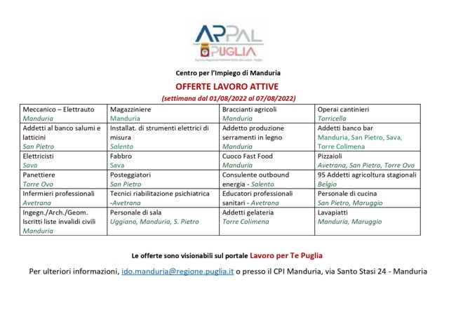 Anche per questa settimana sono tante le figure ricercate dal Centro per l’Impiego per essere inserite nel mondo del lavoro. Eccole riepilogate nella tabella.