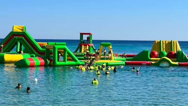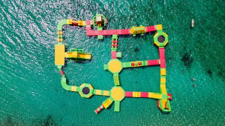 E’ composto da ben 40 moduli: il percorso include uno scivolo gigante, una torre di volo, un grande cuscino di lancio, ponte di anelli e trampolini.