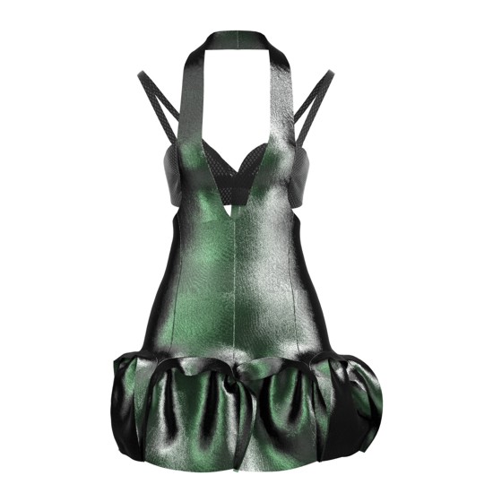 Mi hanno ispirato le alghe del fiume Chidro, dentro il quale si nascondono pesciolini e rane. Sono cangianti, quando sono in acqua sono lucide e con una parvenza di struttura verticale e se uscite dall'acqua più opache e morbide. A volte sono proprio le cose meno visibili che impressionano. Vengo dalla capitale dell'Uzbekistan, Tashkent, che vuol dire città dei sassi e abbiamo un ambiente completamente differente, quindi questa differenza è arrivata con forza nei miei occhi. Ho cercato quindi di dare questo tocco al mio abito, cangiante, vellutato e rigido allo stesso tempo.