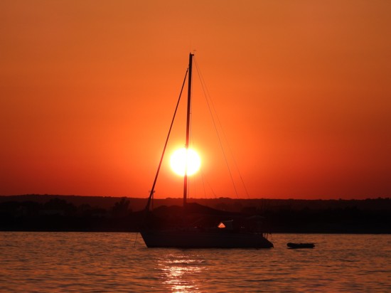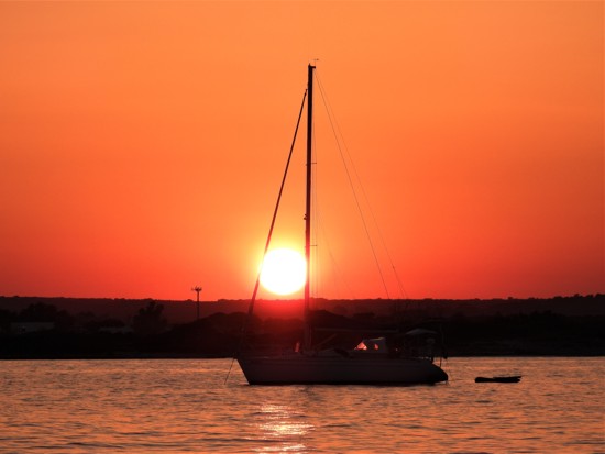 Il sole sprofonda nel punto in cui toccano cielo e mare, a far da cornice ad una imbarcazione ancorata a poche decine di metri dalla battigia
