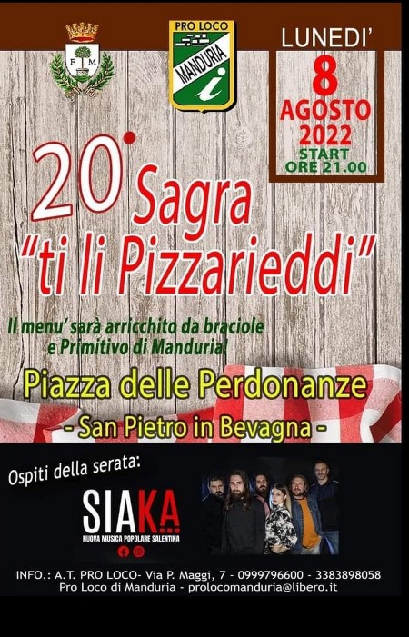 La “Sagra ti li Pizzarieddi” festeggia il suo 20° anno di vita l’8 agosto in piazza delle Perdonanze a San Pietro in Bevagna a partire dalle ore 21.