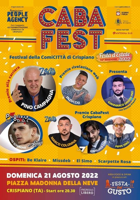 Domenica 21 agosto, dalle 20.30, torna il "Cabafest", il festival della Comicittà di Crispiano in provincia di Taranto organizzato dall'associazione di promozione sociale People Agency in collaborazione del Comune di Crispiano.