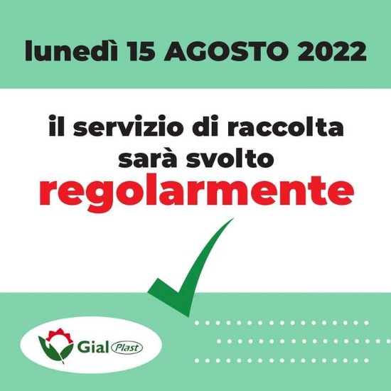 Nella giornata di Ferragosto i rifiuti saranno ritirati regolarmente. Essendo un lunedì, sarà raccolta la frazione organica dei rifiuti.