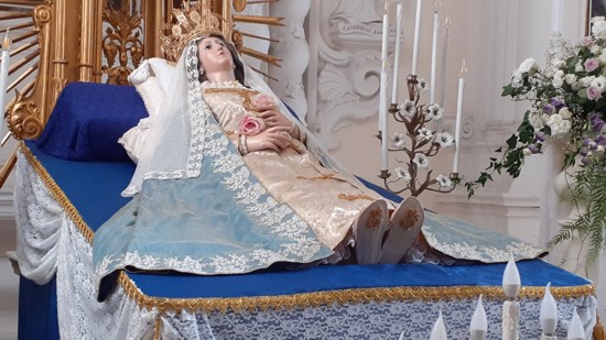 A Manduria, la devozione popolare verso quella che è la principale festa mariana del calendario liturgico è molto sentita. In passato numerosi manduriani si recavano nella chiesetta dell’Assunta, percorrendo la ‘Štrata longa’, oggi via Tommaso Maria Ferrara, riccamente addobbata dai devoti con vasi di piante e luci, in onore della Vergine Maria. Attualmente la solennità dell’Assunzione di Maria viene celebrata in tutte le chiese cittadine. Nella chiesa della Madonna del Rosario, le celebrazioni hanno per oggetto una statua raffigurante la ‘Dormizione di Maria’. Essa viene esposta in chiesa a partire dal 12 agosto per un triduo (12-13-14 agosto), è poi oggetto di una veglia nella notte del 14 agosto (la notte della Pasqua di Maria), fino alla celebrazione solenne del 15 agosto, quando il fedele, con l’animo colmo di fede, ammira e venera quelle delicate fattezze prossime ad assurgere alla gloria divina eppur temprate da tanta umana sofferenza. L’autore dell’opera è ignoto, non esiste una bibliografia su di essa, eppure la vista della statua della Vergine Maria distesa su di un lenzuolo bianco in un catafalco di vetro, con il manto celeste spiegato in tutta la sua composta regalità, trasmette all’osservatore un brivido di fede che lo scuote dalla propria normalità elevandolo a una indefinibile dimensione spirituale. Si tratta di un’opera collocabile verso la metà del XIX secolo e di dimensioni importanti (cm 158x50x88). Le mani e i piedi della Vergine sono in cartapesta dipinta, la testa in terracotta, il corpo modellato su un manichino di paglia rivestito di bellissimi abiti di stoffa. Originariamente collocato nella Chiesetta del Crocifisso dell’Annunziata, il simulacro della Vergine dormiente è stata oggetto di restauro nel 2016 e trasferita nella chiesa della Madonna del Rosario, dove tuttora si trova. Essa rientra nel novero delle opere a tema mariano conosciute come ‘Dormitio Virginis’. Teologicamente, quello della ‘Dormitio’ è un tema trattato dai Padri della Chiesa per indicare il trapasso di Maria, definito nel mondo ortodosso con il termine greco ‘Koimesis’, mentre in quello occidentale con il termine latino ‘Dormitio’: una condizione di addormentamento che segna il passaggio dalla vita sulla terra a quella nella gloria celeste, attraverso l’assunzione alla gloria celeste, in anima e corpo. Fu papa Pio XII il 1° novembre del 1950, Anno Santo, a proclamare solennemente per la Chiesa cattolica come dogma di fede l’Assunzione della Vergine Maria al cielo con la Costituzione apostolica ‘Munificentissimus Deus’.