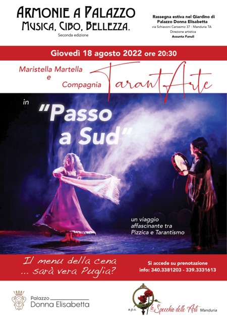 Maristella Martella e la Compagnia Tarantarte si esibiranno in“Passo a Sud”, un viaggio affascinante tra pizzica e tarantismo con l’intento di trasmettere in musica i gusti, lo spirito, i conflitti e le speranze del tempo attuale oltre a tramandare i valori sociali e culturali della tradizione del Sud.