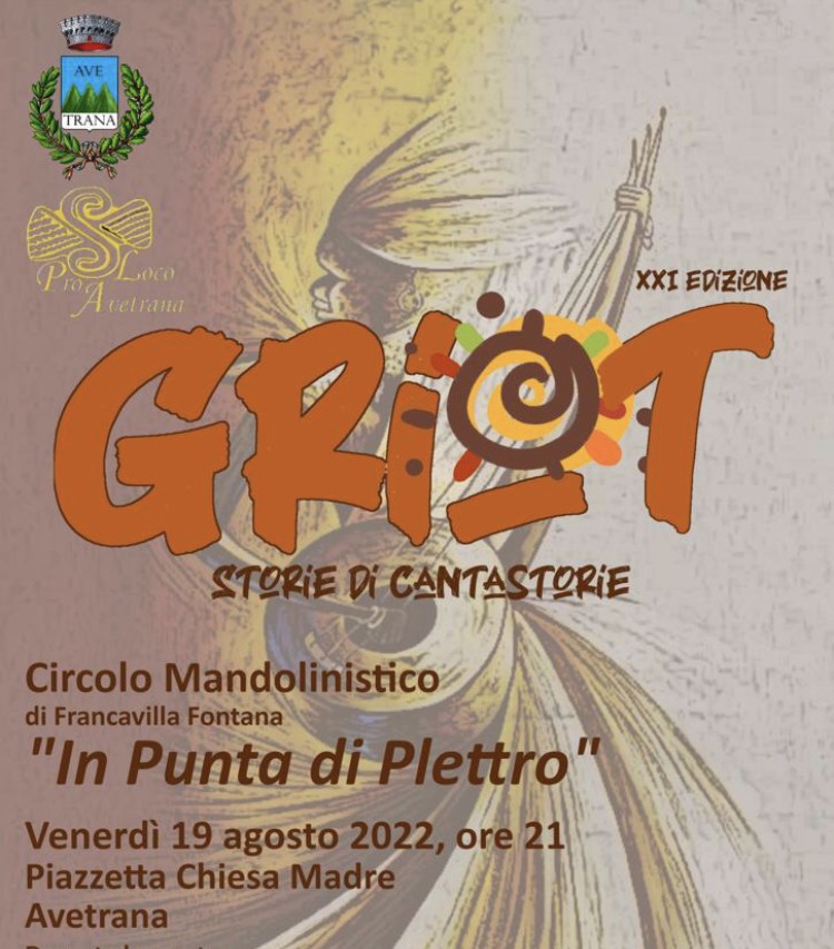 Si svolgerà Venerdì 19 agosto, alle ore 21, la XXI edizione di Griot. Resta invariata la location, piazzetta chiesa Madre, nel cuore del centro di Avetrana, quest’anno abbellito grazie all’intervento di associazioni, comitati, cittadini coordinati dall’Amministrazione comunale che ha manifestato e dimostrato la volontà di valorizzare lo stesso centro storico.