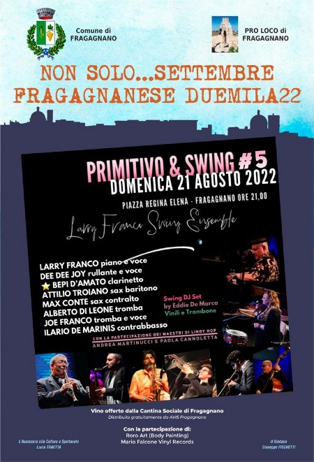 Nell’ambito della rassegna “Non solo...Settembre fragagnanese”, domani (domenica 21 agosto), alle ore 21, in piazza Regina Elena, a Fragagnano, si terrà la quinta edizione di PRIMITIVO & SWING, la manifestazione eno-musicale ideata dall’associazione culturale Centro Musica del Borgo, in collaborazione con il Comune, la Proloco e la Cantina Sociale di Fragagnano.