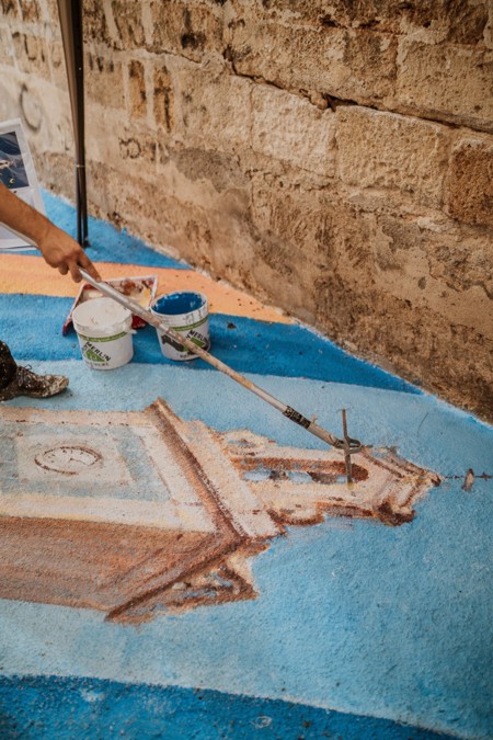 Con lo sguardo rivolto verso il basso si attraverseranno simboli identitari della comunità come l’acqua, rappresentata con fasce blu e celesti, per poi incontrare gli ulivi e le spighe di grano. Il tutto in un abbraccio ideale con latTorre civica, castello Imperiali e le maioliche della cupola della basilica minore del Santissimo Rosario.