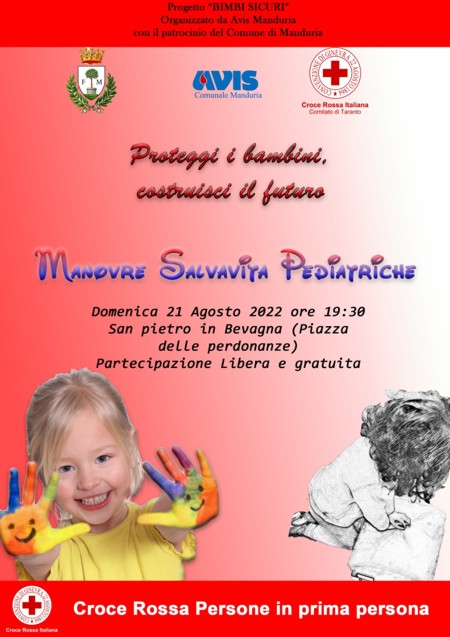 Anche per quest’anno l’Avis di Manduria ha organizzato, nell’ambito del progetto “Bimbi Sicuri”, per domenica 21 agosto, alle ore 19:30, in piazza delle Perdonanze a San Pietro in Bevagna, una dimostrazione pratica delle manovre salvavita pediatriche.