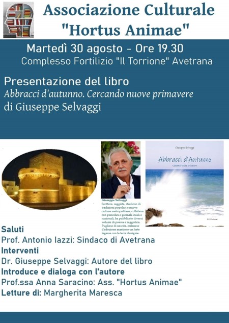 Martedì 30 agosto, alle 19,30, nel torrione di Avetrana, su iniziativa dell’associazione “Hortus Animae”, avrà luogo la presentazione del libro “Abbracci d’autunno. Cercando nuove primavere” di Giuseppe Selvaggi.