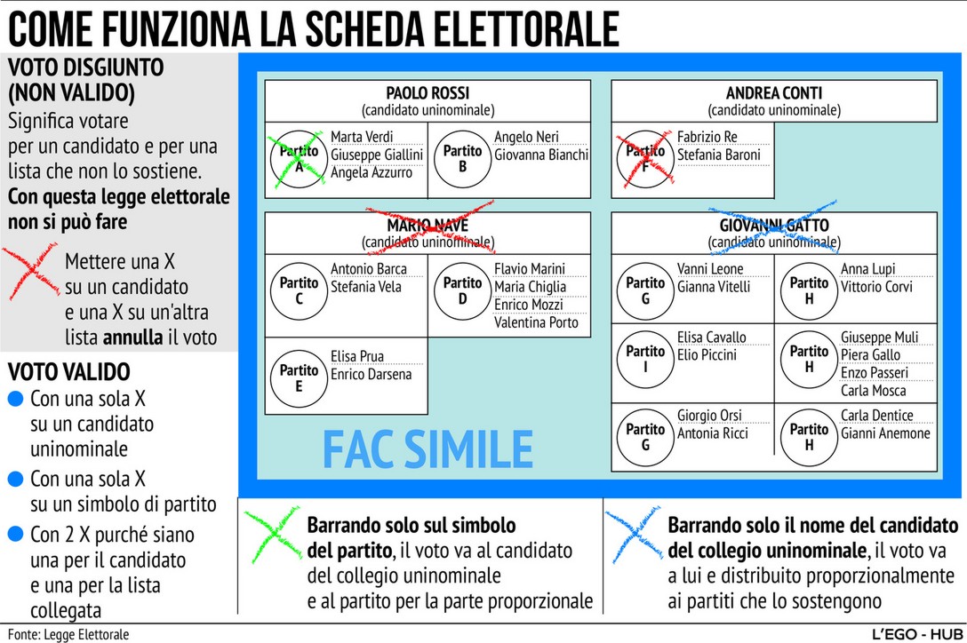 Il mix di sistema elettorale maggioritario e proporzionale previsto dal Rosatellum, nonostante renda il meccanismo di assegnazione dei collegi più complesso, non implica particolari difficoltà al momento del voto nel seggio elettorale. Ogni elettore riceverà due schede, una per la Camera dei deputati e una per il Senato