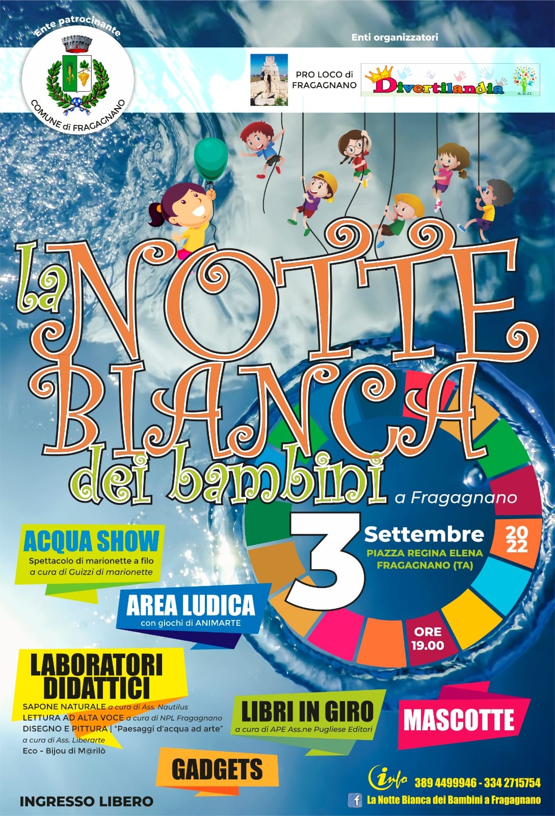 Dopo la pausa forzata dovuta alla pandemia, sabato 3 settembre, a partire dalle ore 19, in piazza Regina Elena, a Fragagnano, torna La Notte Bianca dei Bambini, l’evento dell'anno più atteso dalle famiglie, organizzato dalla Pro loco di Fragagnano e dall'Asd Divertilandia e patrocinato dal Comune di Fragagnano.
