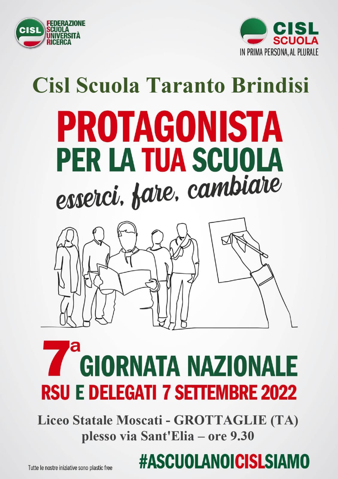 La Cisl Scuola Taranto Brindisi ha organizzato, nell’ambito dell’iniziativa nazionale, la “7° Giornata delle RSU e dei delegati” della Scuola delle due province che si terrà il prossimo 7 settembre, dalle ore 9.30 presso il liceo statale “Moscati”, sede in via Sant’Elia, a Grottaglie.