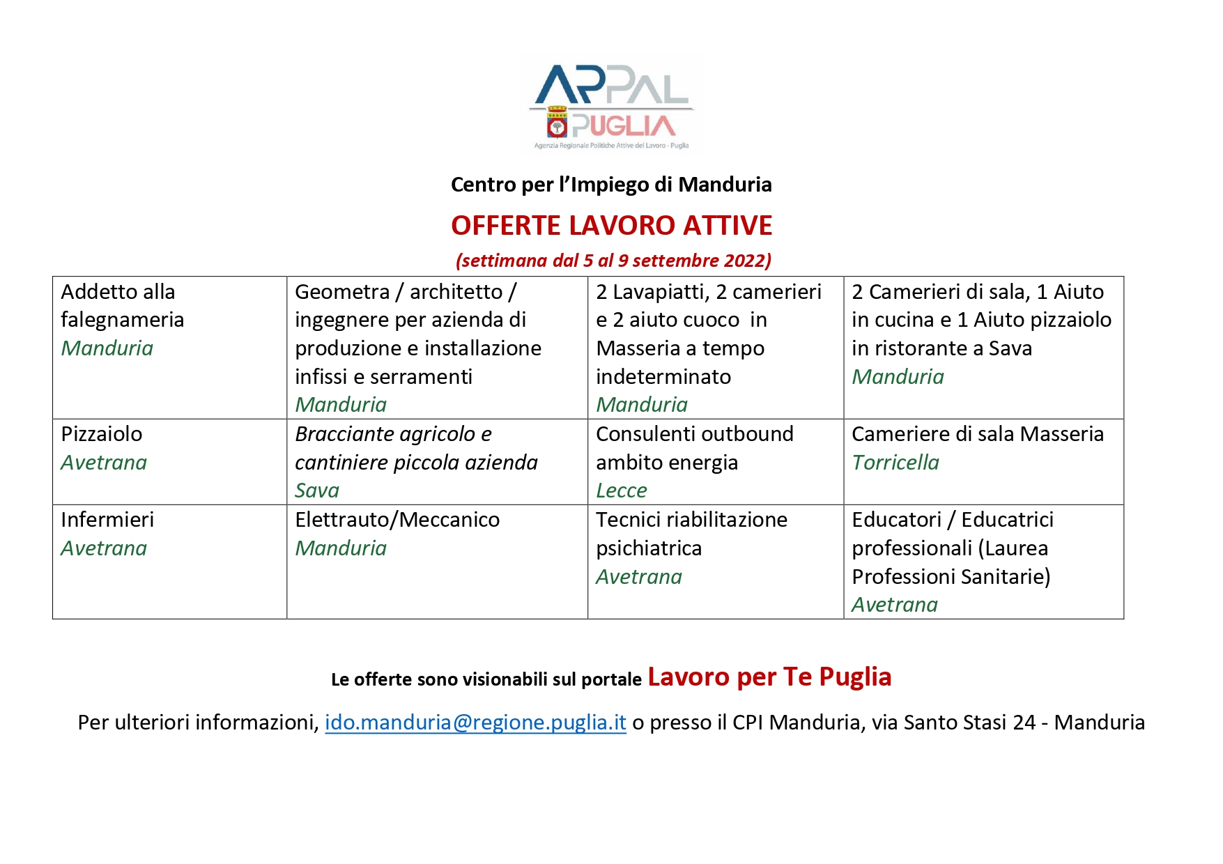 Nuove opportunità occupazionali dal Centro per l’Impiego di Manduria. Sono riepilogati nell’immagine a corredo dell’articolo. La maggior parte di richiesta di personale proviene da aziende della zona: Manduria, Sava, Avetrana e Torricella.