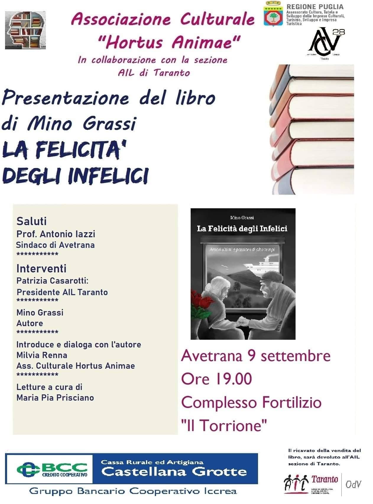 Venerdì prossimo, 9 settembre, l’associazione culturale Hortus Animae, in collaborazione con l'AIL di Taranto, presenta il libro del giornalista Mino Grassi “La felicità degli infelici” ,un libro inserito nell’ambito delle iniziative del progetto sociale “Mi ricordo ancora”, promosso dall’associazione culturale 28, da decenni impegnata in campo educativo e formativo. Un libro solidale, quindi, in quanto i proventi della vendita saranno destinati a finanziare un progetto dell'AIL, da sempre impegnata a sostenere i malati ematologici dell'intera provincia.