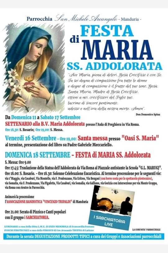 Il settenario alla beata vergine Maria Addolorata aprirà, domenica 11 settembre, il programma delle celebrazioni previste nei festeggiamenti in onore di Maria SS. Addolorata. Sino a sabato 17 settembre, ogni giorno, alle 18,30, nella chiesa di San Michele Arcangelo, sarà recitato il Rosario, cui seguirà, alle 19, la celebrazione nella Messa.