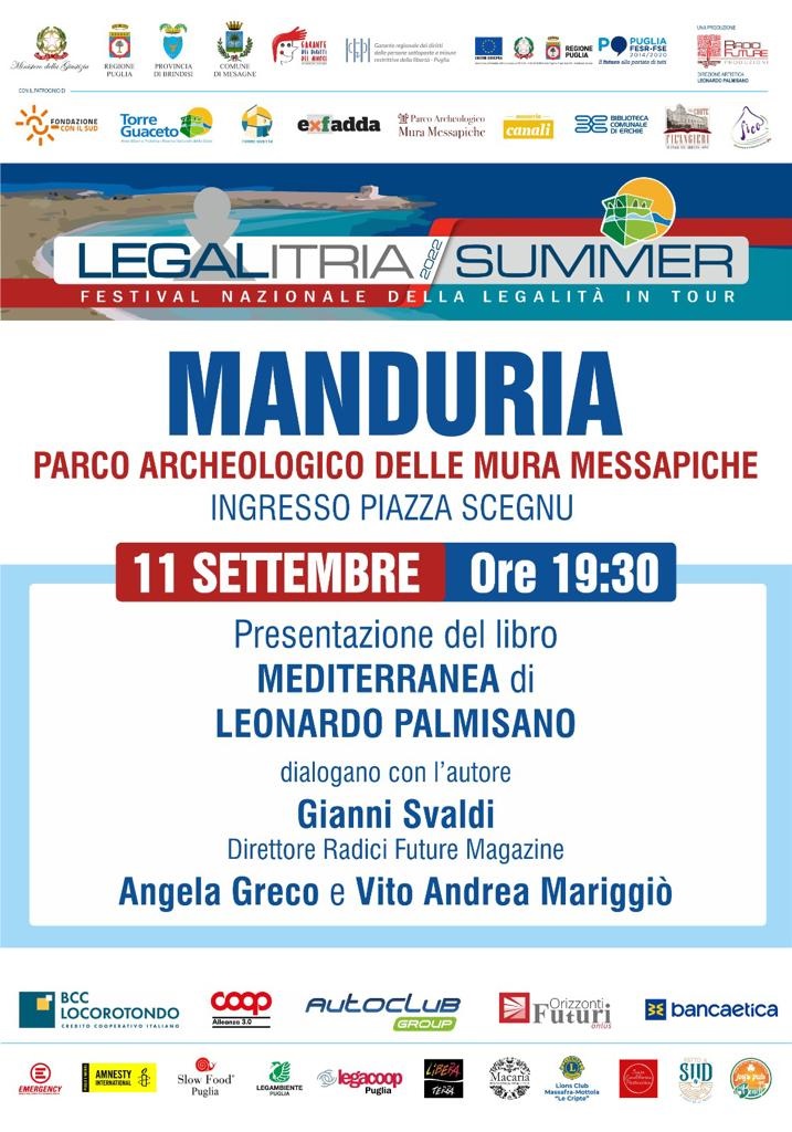 Ora, per la serata conclusiva del festival, Legalitria approda per la prima volta a Manduria all’interno della straordinaria cornice del Parco Archeologico delle Mura Messapiche. Un traguardo raggiunto grazie alla stretta collaborazione tra l’Amministrazione comunale della città Messapica, la cooperativa Radici Future Produzioni, la cooperativa Spirito Salentino e il gruppo gestione Cuore Messapico, ente gestore del Parco Archeologico.