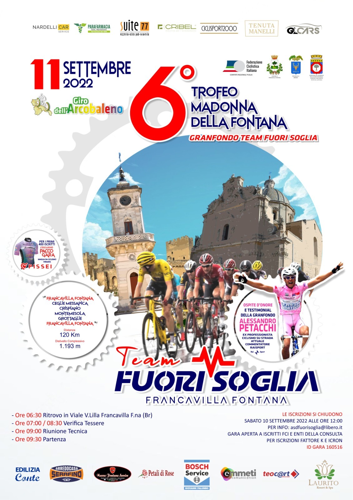 Il rientro dei primi atleti avverrà intorno alle 12:30 arrivando dal cavalcavia della provinciale per San Marzano, proseguendo su via D’Angiò, per concludersi su viale V.zo Lilla. Al termine della gara, intorno alle 13:15 circa, avverrà la premiazione dei vincitori. Tutta la manifestazione sarà impreziosita dalla presenza dell’ex professionista ciclista Alessandro Petacchi, ora commentatore degli eventi ciclistici sulle reti Rai che percorrerà, senza competere, le strade di tutto il percorso di 120 km. Sarà un’occasione più unica che rara per gli amatori, correre accanto ad un ex professionista del calibro di Petacchi, vincitore di diverse gare e tappe al Giro d’Italia, Tour de France e Vuelta a España.