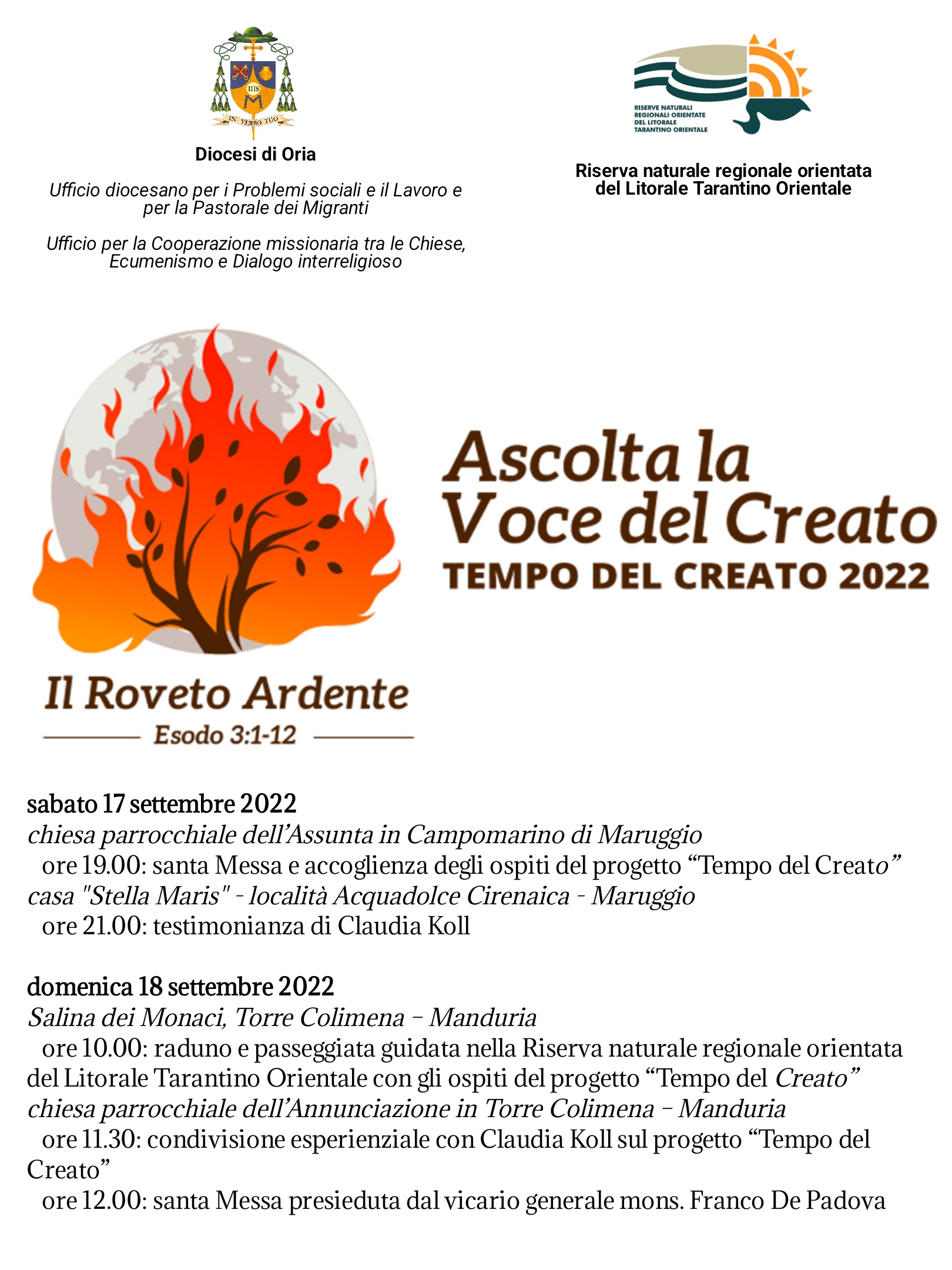 L'Ufficio per i Problemi sociali e il Lavoro e per la Pastorale dei Migranti e l'Ufficio per la Cooperazione missionaria tra le Chiese, Ecumenismo e Dialogo interreligioso della Diocesi di Oria, con la collaborazione della Riserva naturale regionale orientata del Litorale Tarantino Orientale, organizzano l'iniziativa “Ascolta la voce del creato - Tempo del Creato 2022".