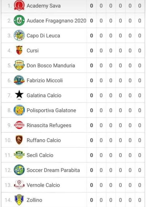 Questo l’elenco delle squadre del girone C: Academy Sava; Audace Fragagnano, Capo di Leuca, Cursi, Don Bosco Manduria, Fabrizio Miccoli, Galatina Calcio, Polisportiva Galatone, Rinascita Refugees, Ruffano Calcio, Seclì Calcio, Soccer Dream Parabita, Vernole, Zollino.