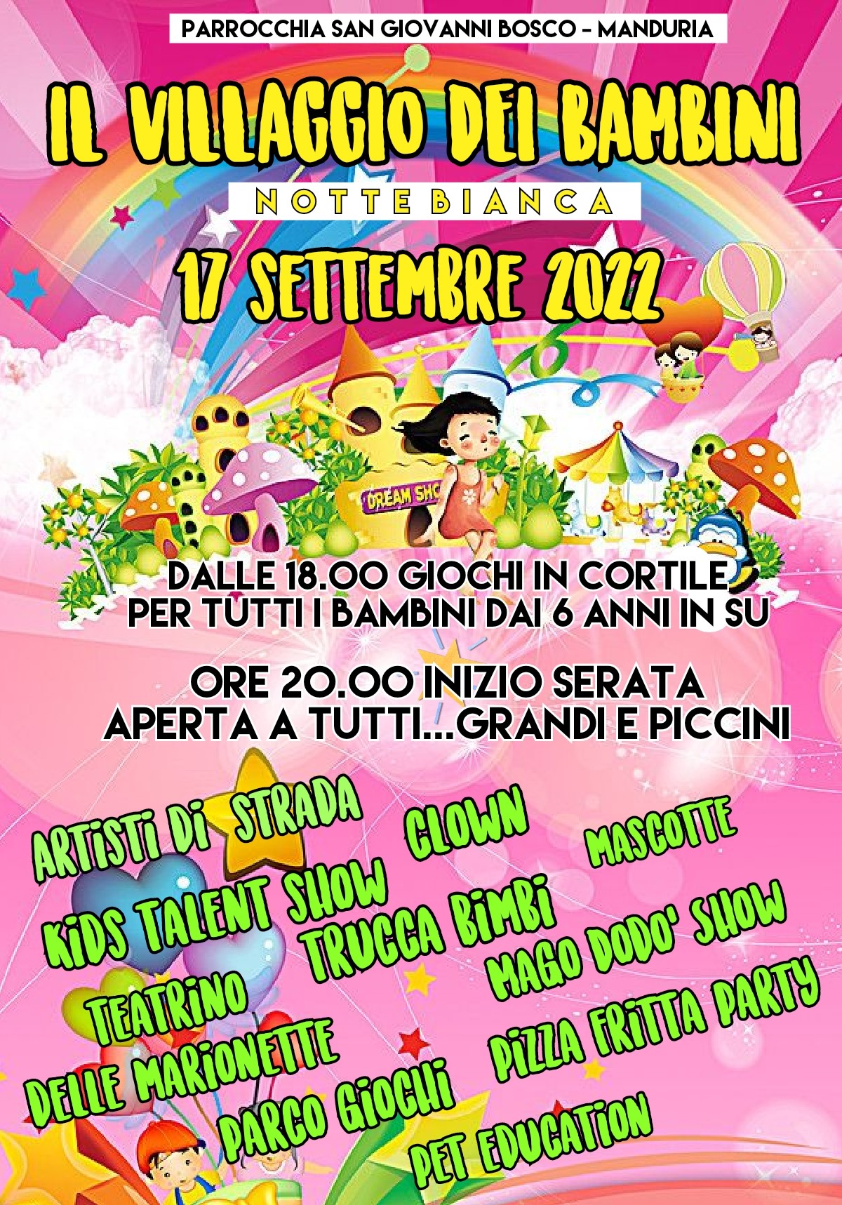 La parrocchia San Giovanni Bosco di Manduria, con la preziosa operosità degli animatori e degli adulti della comunità presenta oggi (sabato 17 settembre), la prima edizione de “Il Villaggio dei Bambini”, richiamando a raduno tutti i ragazzi dell'oratorio e del catechismo all'inizio del nuovo anno pastorale.