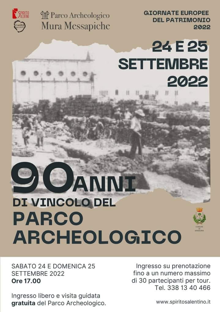 Queste giornate speciali dedicate ai 90 ANNI dal vincolo archeologico al parco saranno anche occasione per presentare,durante i tour, la figura dell’illustre cittadino di Manduria, già noto per il ruolo di direttore della biblioteca comunale “ Marco Gatti”, meno per il suo importante impegno come ispettore onorario del Dipartimento Antichità dell’allora Ministero della Pubblica Istruzione, incarico che gli permise, tra le altre cose, di realizzare il primo antiquarium nella biblioteca stessa.