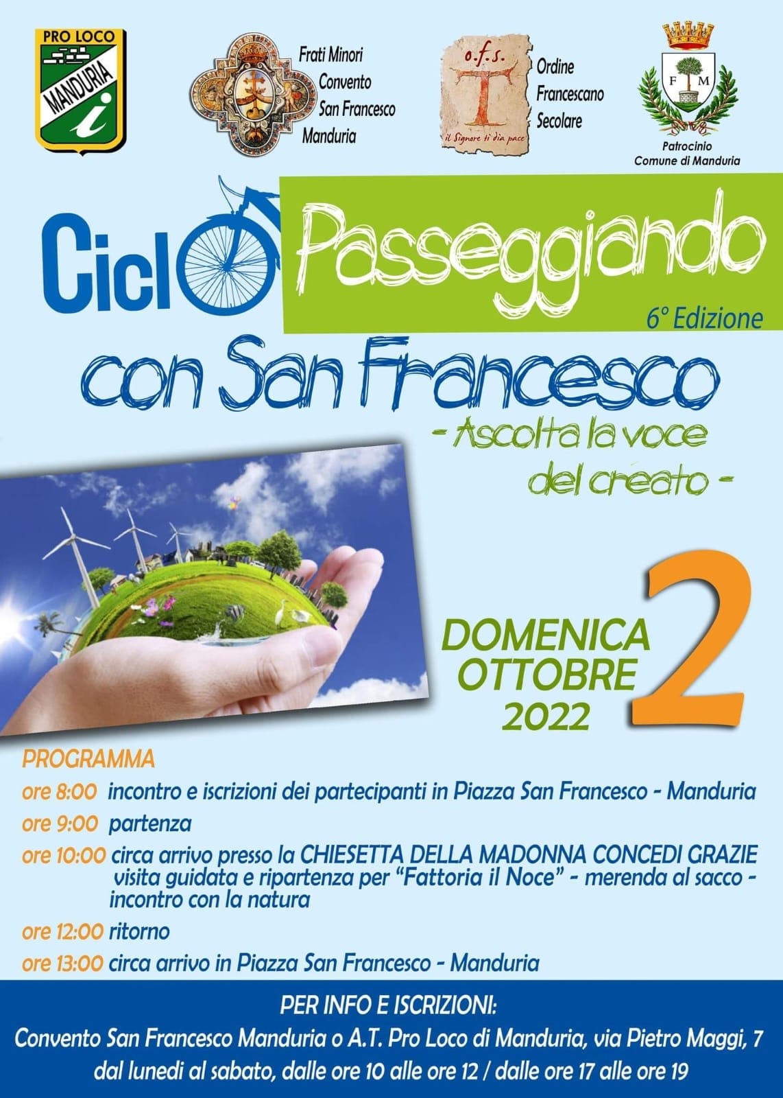 Domenica mattina 2 ottobre i frati minori del Convento di San Francesco di Manduria, in collaborazione con la Pro Loco di Manduria, organizzano la sesta edizione de “Ciclopasseggiando con San Francesco” in occasione della festa del patrono d’Italia e dell’ecologia. Una giornata da passare immersi nella natura attraversando la campagna in sella ad una bici, mezzo di trasporto più ecologico in assoluto che invita all’esplorazione lenta e sostenibile del territorio ed alla riflessione su temi quali la salvaguardia dell’ambiente e la fragile bellezza del territorio lasciatoci in eredità.