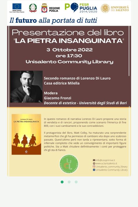 Lunedì prossimo, 3 ottobre, alle 17:30, nuova presentazione del libro “La pietra insanguinata” di Lorenzo Di Lauro presso la Unisalento Community Library, all’Ekotecne di Lecce.