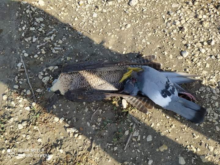«Una mattanza: Falco pellegrino ritrovato a Leverano, impallinato e ucciso subito dopo aver predato» è riportato in un post di SOS Fauna Calimera. «Lui è morto con la sua ambita preda tra le zampe. Era un esemplare davvero notevole, sia per la forma fisica sia per le dimensioni.