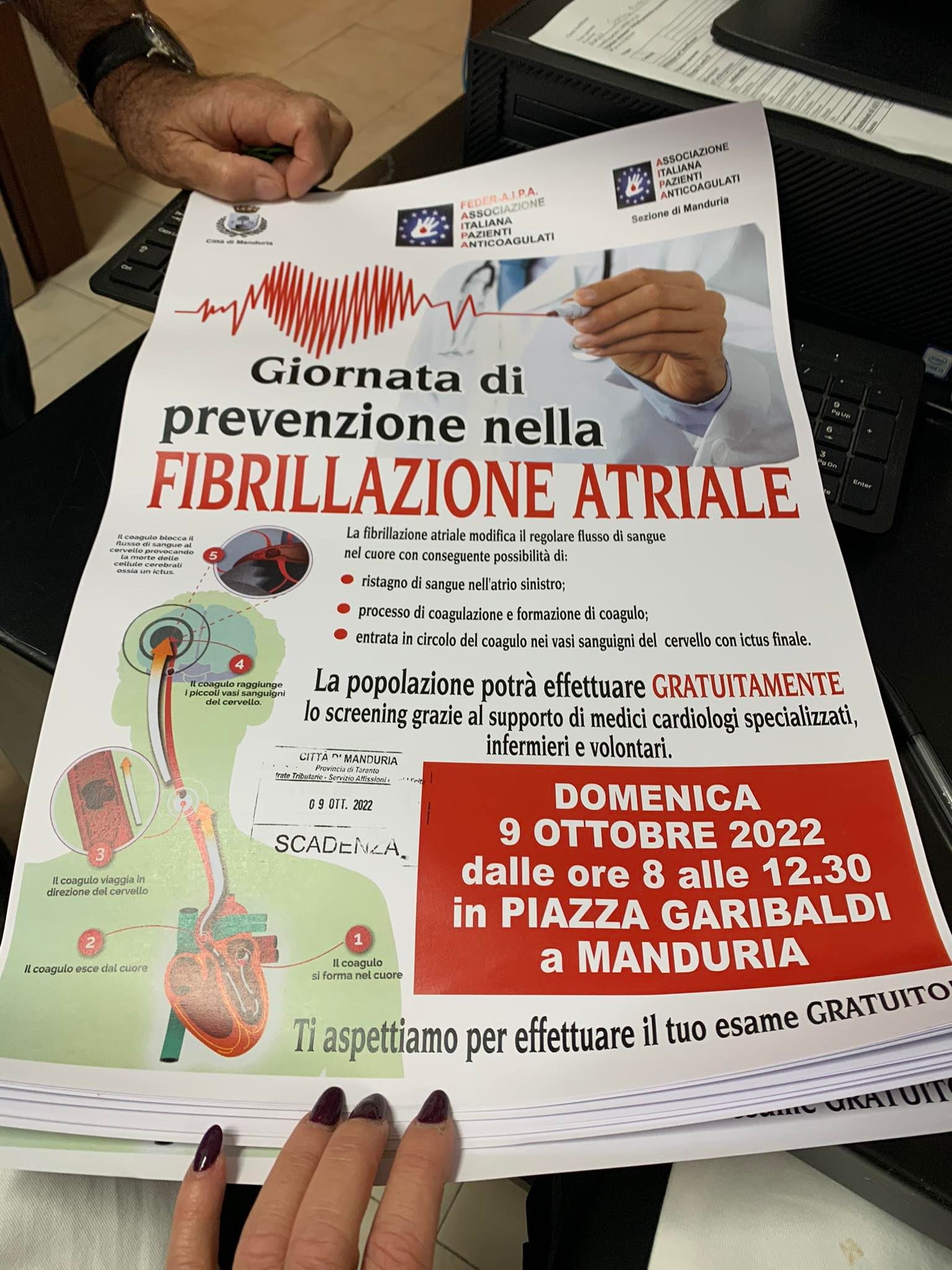 Ritorna a Manduria la Giornata della Prevenzione della Fibrillazione Atriale, promossa dal centro TAO del “Marianna Giannuzzi” di Manduria, da FederAipa e dalla sezione di Manduria dell’Associazione Italiana Pazienti Anticoagulati, in collaborazione con il Comune di Manduria.